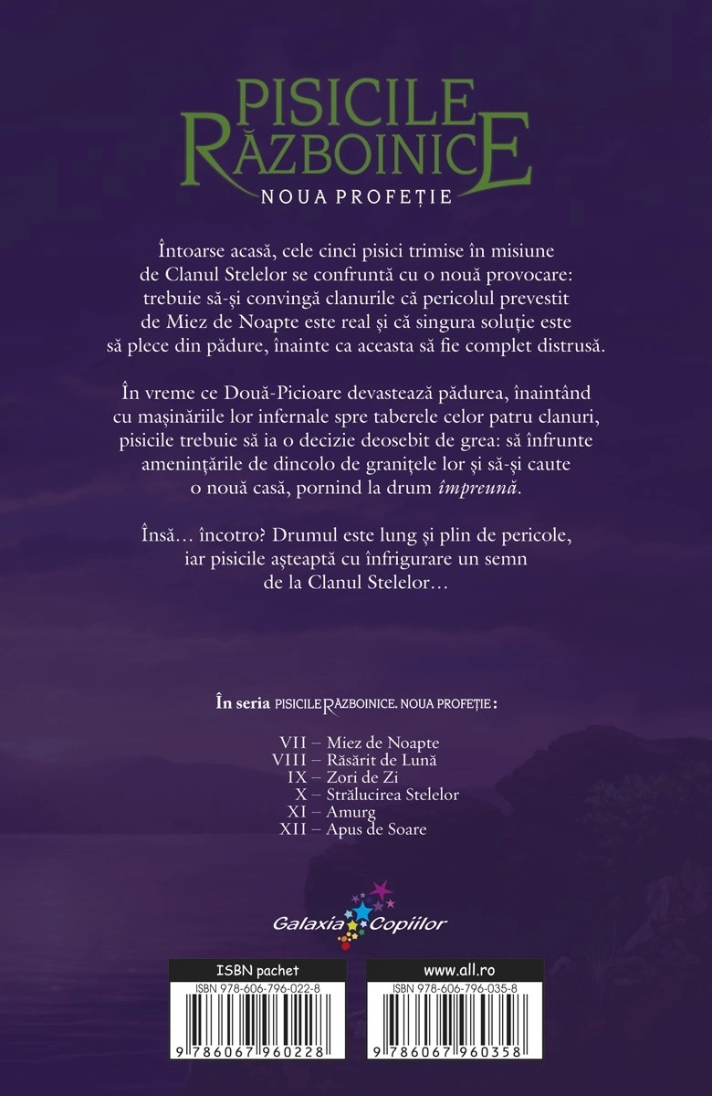 - Seria NOUA PROFEȚIE surprinde destinul celei mai tinere generații de războinici, urmașii eroilor din primele șase cărți. Dacă până acum clanurile de pisici sălbatice trăiau izolate în pădure, din acest moment, duhoarea pe care o răspândesc Două-Picioare – așa cum sunt supranumiți oamenii – se simte pe fiecare frunză uscată, pe fiecare creangă. „Clan al Stelelor, oprește-i!”, se înalță rugămințile disperate ale pisicilor către spiritele strămoșilor, dar rămân fără niciun răspuns. Două-Picioare continuă să devasteze pădurea cu mașinăriile lor infernale, până la căderea ultimului stejar. Patru Stejari, locul în care cele patru clanuri se întâlneau de multe, multe generații, nu mai există. Piatra Înaltă, stânca impozantă pe care stăteau liderii clanurilor când se adresau Adunării, pare acum mică și neajutorată, ca un pui ghemuit.